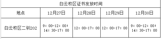 三、本学期证书发放时间见下表,白云校区仅四天发放时间,学生可在测试站发放时间自行前往东校区实验楼1.5层或白云校区二训202领取。请在规定时间内领取证书,超过3个月未领取的证书将由我站进行统一处理。(网安学院、计科院、音乐学院、民族学院、体育学院、数据学院和美术学院请前往东校区值班点领取证书,其余学院在白云校区领取证书)