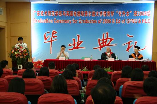 哈德斯费尔德大学外审官Colin Brock博士和项目负责人Lyn Hall女士发表了祝贺演说。Brock博士高度评价了中国学生在学习期间所表现出来的勤奋和聪颖,并向获得学士学位的学生表示诚挚祝贺。毕业生代表封瑞鸾也在典礼仪式上作了发言。