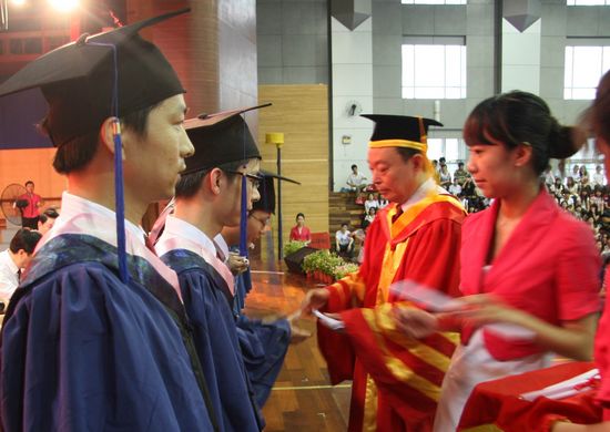在学生处负责人、研究生处负责人宣读了学院有关表彰决定之后,学院党政领导为获得“优秀毕业生”“国家奖学金”“优秀三好学生”“三好学生”“优秀学生干部”等单项奖的毕业生代表颁奖;学院党委书记邝邦洪向考取博士研究生的同学和导师颁发了奖金;院长王乐夫向获得学士学位和硕士学位的优秀毕业生代表授予了学位。