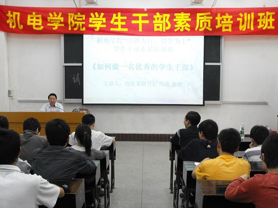 为进一步深化“以德为行,以学为上”教育思想,增强学生干部的学习意识和责任意识,提高干部的素质,机电学院于2月16日至18日召开了为期三天的“以德为行,以学为上”学生干部素质培训班,学院各级学生组织干部共187人提前回校参加了培训。校党委副书记吕清教授出席培训班并为学生干部做题为《如何做一名优秀的学生干部》的专题讲座。