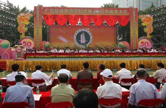羊城十月,秋风送爽。在这硕果累累、桃李芬芳的日子里,广东技术师范学院迎来了50华诞的大喜日子。会场彩旗鲜花争艳,歌声笑声相闻,校园里到处都洋溢着喜庆的气氛。五十年的路程,坎坷不平;五十年的追求,矢志不渝;五十年的奋斗,春华秋实;五十年的光阴,铸就辉煌。