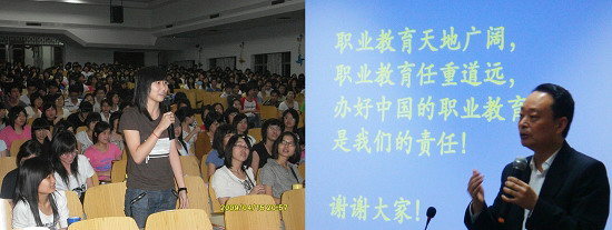 为了使广大学生充分了解伟德官网“面向职教,服务职教,引领职教”基本定位的深刻内涵,王乐夫校长从科学发展观的基本定义、科学发展教育观的基本内容和国家为什么高度重视职业教育发展的背景、发展职业教育的必要性及面临的困难与问题向同学们作了全面的介绍,并就如何解决职教发展问题介绍了国内外先进的理念和不同层次兄弟院校好的经验。王乐夫校长还就如何当一名合格的职教教师向同学们提出了要求。王乐夫校长还以同学们身边的鲜活事例鼓励大家勤奋学习,努力争先,以自己的专业为基础不断增强自己的核心竞争力,为成为一名光荣的职教教师或应用型高级专门人才作准备,王乐夫校长的报告图文并茂,信息量大,讲述生动,引起同学们浓厚的兴趣。在报告会中,同学们就如何提高师范技能,如何增强就业核心竞争力,以及学校发展建设和管理中的许多问题和王乐夫校长展开了热烈的互动讨论。同学们表示希望能够经常听到这样的报告。