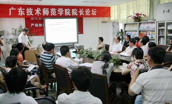9月27日,广东技术师范学院院长论坛第三讲在校本部实验楼502室举行。教育技术与传播学院院长董武绍教授作了题为“对我国教育技术发展的研究”的学术报告。学校校长王乐夫教授、副校长林伦伦教授出席了报告会,科研处、教务处、研究生处、网络中心部门负责同志,传播学院全体教师以及部分学生参加并听取了报告会。
