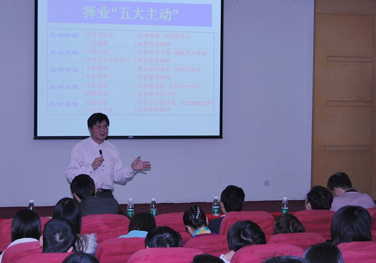 岳晓东教授紧紧围绕“大学生如何做最好的自己”这个主线,抓住“行动力”和“主动出击(寻找生命中的贵人)”这两个关键词,对大学生生涯规划,实现成功就业创业提出了五大建议:一是了解自我——扬长避短,发挥优势;二是目标设定——规划自己的人生;三是坚持不懈——走自己的路;四是主动出击——寻找生命中的贵人;五是灵活调整——创造自己的人生。他指出毕业生择业要“五大主动”(主动联络、主动求助、主动学习、主动反省、主动调整),还就“生涯投资理论”,“5%差异论”等内容结合案例分析和本人的成长经历进行了阐述与分享。岳教授寄语广大学子“5%的多余努力积累下来会决定100%的差异”,“做最好的自己,无论在哪里”。讲座过程中,岳晓东教授旁征博引,风趣幽默,并与同学们进行现场互动。整个讲座,座无虚席,精彩纷呈,高潮迭起,始终洋溢着掌声和笑声。