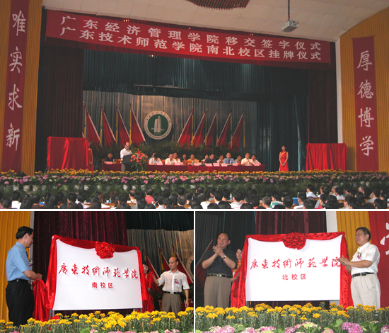 5月17日,广东技术师范学院在原广东经济管理学院的怡乐校区和瑶台校区分别举行隆重的挂牌仪式。省委组织部有关部门负责人何巨峰处长、张敏调研员,省教育厅厅长郑德涛、张泰岭巡视员、省经贸委主任陈冰、副主任罗坚生,以及省教育厅和省经贸委有关处的负责同志,学院领导谭泽中、黄晋生、程飚、李月、潘自勉、冯创仪出席揭牌仪式。