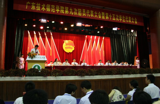 在洋溢着青春的激情与光荣的五月里,共青团广东技术师范学院第九次团员代表大会暨第十五次学生代表大会于5月26日上午在校本部综合馆三楼隆重召开。团省委副书记白涛、校党委邝邦洪书记,王乐夫校长,校党委副书记、校关工委主任吕清,校党委副书记罗海鸥,以及学校有关部门领导和各学院党总支书记、副书记出席了本次大会。校工会、省学联及各兄弟高校团委、学生会发来贺信。共青团广东技术师范学院第八届委员会书记白雪飞主持大会。