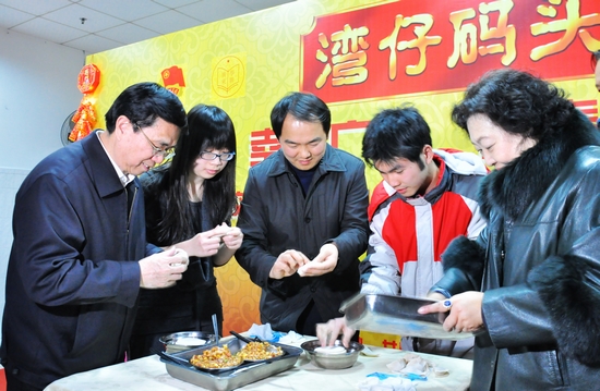 春节前夕,学院春晖园饭堂三楼装扮一新,喜气洋洋,由团省委、省学联主办,我院团委承办的“幸福广东•青春情暖——湾仔码头水饺皇后臧健和女士与留校大学生包饺子过大年活动”在这里隆重举行。团省委书记陈东、团省委副书记曾颖如,学院党委书记邝邦洪、学院副院长林卓及团省委学校部部长张文杰等领导出席了活动,我院200多名留校大学生代表参加了活动。“湾仔码头”公司创始人臧健和女士出席活动并为留校学生作了励志专题讲座。