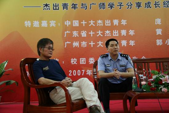 图:郭小东(左)、庞波(右)与学生互动,分享成长经验。