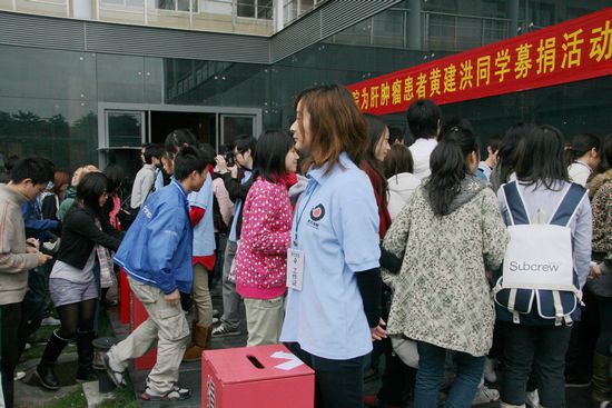 1月6日下午,美术学院在美术馆门前为黄建洪同学举办爱心捐款活动。黄建洪同学是美术学院2006级多媒体班学生,出生于广东省肇庆的一个农民家庭,12月25日被诊断出肝癌,高达20多万元的手术费、治疗费,让本不富裕的家庭雪上加霜。为此,美术学院2006级多媒体全体同学发出倡议,希望更多的师生献出爱心。1月7日下午16:30—18:30,1月8日上午10:00—13:00,下午16:30—18:30将在新篮球场现场募捐。联系人和联系电话:徐艳贞老师,电话38256712;王燕,13480211825(661825);石家柱,13824443247(663247)。(美术学院)