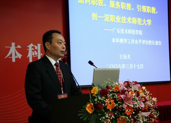 王乐夫校长代表学校向专家组作了题为《面向职教、服务职教、引领职教、创一流职业技术师范学院》的本科教学工作汇报。汇报分为学校概况、本科教学工作、办学特色、评建工作情况以及存在的问题及努力方向五个部分。王乐夫校长在汇报中指出,今天的广东技术师范学院经过几代人50年的艰苦奋斗,已发展成为以理工和经管为主,理、工、经、管、文、教、法等多学科协调发展;以本科教育为主、积极发展研究生教育、兼顾各类成人继续教育与培训的多层次教育体系的省属教学型普通高校。在本科教学工作上,近年来,学校从以民族教育为主,向培养职业教育师资为主的办学定位转变,确立了“面向职教、服务职教、引领职教”的办学定位,明确了“坚持以人才培养为根本,坚持以学科建设为龙头,坚持以师资队伍建设为关键,坚持以改善办学条件为基础,坚持以‘职业性、技术性、师范性、学术性’相结合为教改方向,坚持以管理体制改革为动力,坚持以党建与思想政治工作为保障”的办学思路,实行了“教书育人、实践育人、文化育人”三位一体的教育模式和“课堂教学、技能训练、社会实践”三位一体的教学模式,通过重视教学、制度强化教学、经费保障教学、科研促进教学、管理服务教学、舆论宣传教学等多项措施,促进了教学,提高了人才培养的质量。