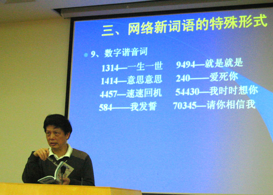 林伦伦教授从语言学研究的角度出发,对网络语言的定义、产生的社会文化背景、特殊形式、流行性作用、存在的问题和应该采取的规范措施六个方面进行剖析。林教授的讲座内容精彩丰富,各种网络流行词语随手拈来,语言幽默风趣,博得现场阵阵笑声。他表示,希望外语系学生可结合专业特点,在英语网络语言研究领域进行大胆的尝试。