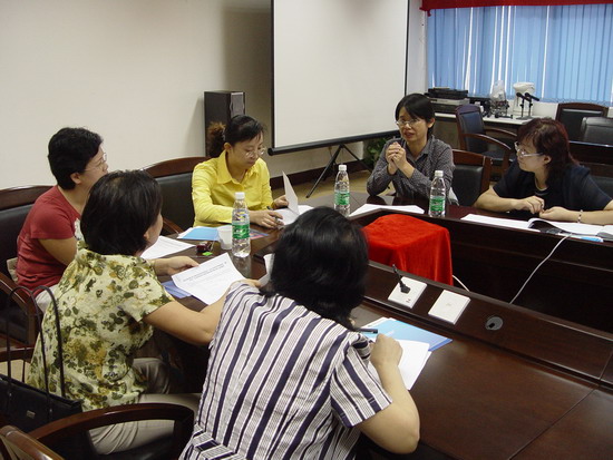 图:教育厅高教处师培中心负责人与任课教师在讨论教学计划和内容