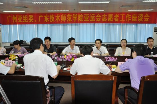 7月7日,广州亚组委志愿者部副部长、团广州市委副书记魏国华率领亚组委有关部处一行8人到我院调研亚运会、亚残运会志愿者工作。学院党委副书记詹步强出席了调研座谈会,学院团委干部及我院亚运对接场馆人力资源副经理(彭炜锋、阳程文、贺王超)与亚组委一行进行了座谈。