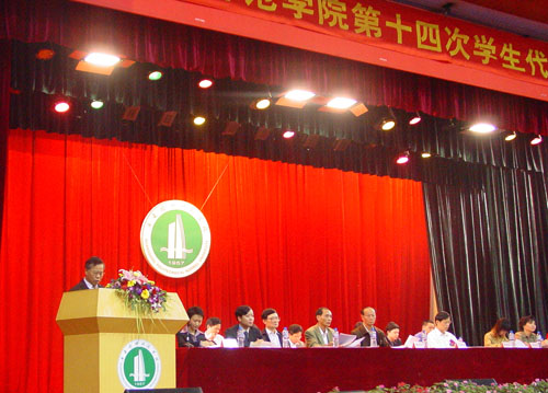 会上,学院党委书记、院长郭斯淦教授作了题为《继承传统 与时俱进 再创佳绩》的讲话。他充分肯定了我院各级学生组织在过去两年所取得的成绩,并代表学院党委对全体代表提出希望和要求:一、引导青年学生高举邓小平理论伟大旗帜,积极实践"三个代表"重要思想,树立科学发展观,全面提高青年学生的综合素质。二、加强校园文化建设,积极开展健康活泼文明的第二课堂活动,大力营造良好的育人环境。三、积极组织青年学生参与社会实践,服务同学,奉献社会。四、加强和改善党团组织对学生会的领导和指导,加强学生会的自身建设,提高学生会的工作水平,促进我院学生工作的新发展。