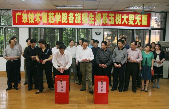 连日来,玉树震区灾情深深地牵动着我院全体师生的心。为表达我院师生对青海玉树地震遇难同胞的深切哀悼,4月21日,院工会组织了“广东技术师范学院各族师生情系玉树大爱无疆”向地震灾区捐款活动。学院党委书记邝邦洪主持了捐款仪式,并率全体人员向在青海玉树地震中遇难的同胞默哀。学院党政领导带头向灾区人民捐款,广大师生踊跃献爱心、慷慨解囊。大家纷纷表示,希望能用自己的爱心增加灾区人民克服困难的信心和勇气,早日渡过难关,重建家园。截至4月23日,共募得我院在职教工善款153680元。目前,这些善款已送到省慈善总会,并由省慈善总会捐往玉树灾区。