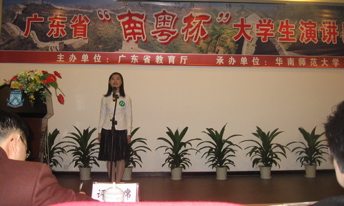 12月15—16日,由广东省教育厅主办,华南师范大学承办的“南粤杯”广东省大学生演讲比赛在华南师范大学大学城校区举行。我院艺术设计系王倩倩同学、外语系梁琼文同学代表学院参加了此次比赛,经过激烈角逐,两位同学皆获得优胜奖。