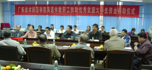 离退办负责人介绍了《广东技术师范学院离退休教职工扶助优秀贫困大学生资金细则》出台的经过以及第一至第三批扶助的对象情况,捐款发起人原学院副院长周少钦同志在仪式上说,开展此项扶贫助学活动,是响应省委关于在离退休老同志中开展“十个一”工程的重要活动之一,动员老同志“奉献爱心,关爱贫困学生”。离退休老同志们希望得到扶助的优秀贫困生学会感恩,将来以努力的工作来回报社会。