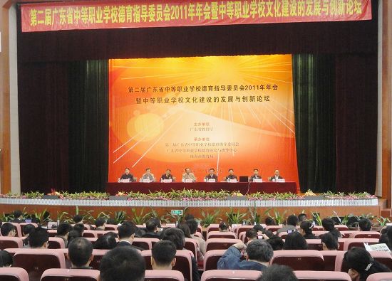 为贯彻落实十七届六中全会和和全国、全省中等职业学校德育工作会议精神,研讨中职学校文化建设的发展与创新,加强中职学校之间的学习与交流,推动全省中职学校德育工作的蓬勃发展,第二届广东省中职学校德育指导委员会2011年年会暨“中等职业学校文化建设的发展与创新”论坛于12月23日至24日在珠海召开,活动由广东省教育厅主办,第二届广东省中等职业学校德育指导委员会(以下简称为“省中职德指委”)、广东省中等职业学校德育研究与指导中心(以下简称为“省中职德育中心”)、珠海市教育局承办,珠海市第一中等职业学校协办。广东省教育厅党组成员、巡视员李小鲁教授,省中职德指委主任委员、学院党委书记邝邦洪教授,省中职德指委副主任委员、学院副院长潘自勉教授,教育部职成司综合处杨克博士,省教育厅思想政汉教育处副处长朱建华,珠海市教育局副局长任金生等领导出席了会议,省中职德指委委员、省属学校、各地级市和顺德区中职学校代表近200人参加会议。