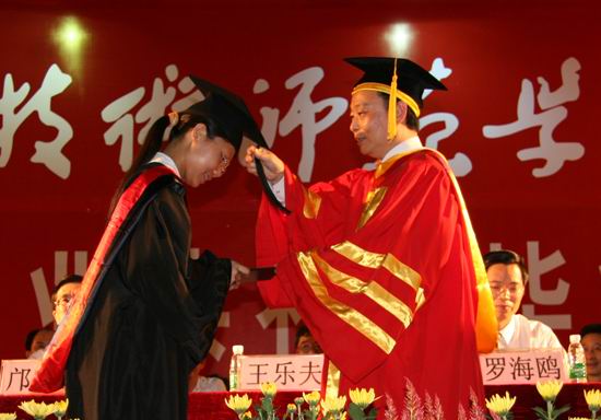 同学们,今天是学校校历上最重要的日子之一,因为我们又有一届莘莘学子毕业了,又向国家输送了一大批高素质的建设人才。2007年,伟德官网共有毕业生8039人,其中校本部4158人(本科毕业生2127人,专科毕业生2031人);独立二级学院天河学院专科毕业生2404人;二级学院翻译学院专科毕业生1477人。