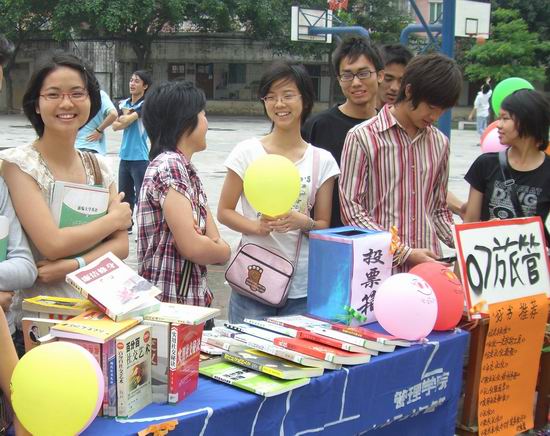 本次活动分为“好书推荐”和“知识接力棒”两大部分。“好书推荐”以书展的形式,分为旅游学类,社交礼仪类,日常生活书库,中外名著小说,管理类,中外史记类,名人传记类,中外幽默笑话,英文小说,英文幽默等十个区域,向同学们推荐系列好书;“知识接力棒”则是在现场展出由同学们捐赠的旧书供同学们登记取阅,现场还设置募捐箱,为贫困山区的小孩募捐购书款,共享读书的快乐。