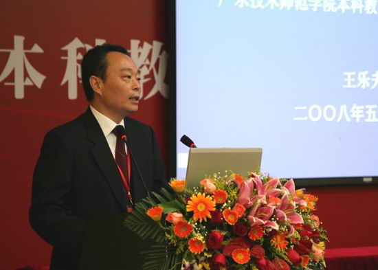 王乐夫校长代表学校向专家组作了题为《面向职教、服务职教、引领职教、创一流职业技术师范大学》的本科教学工作汇报。汇报分为学校概况、本科教学工作、办学特色、评建工作情况以及存在的问题及努力方向五个部分。王乐夫校长在汇报中指出,今天的广东技术师范学院经过几代人50年的艰苦奋斗,已发展成为以理工和经管为主,理、工、经、管、文、教、法等多学科协调发展;以本科教育为主、积极发展研究生教育、兼顾各类成人继续教育与培训的多层次教育体系的省属教学型普通高校。在本科教学工作上,近年来,学校从以民族教育为主,向培养职业教育师资为主的办学定位转变,确立了“面向职教、服务职教、引领职教”的办学定位,明确了“坚持以人才培养为根本,坚持以学科建设为龙头,坚持以师资队伍建设为关键,坚持以改善办学条件为基础,坚持以‘职业性、技术性、师范性、学术性’相结合为教改方向,坚持以管理体制改革为动力,坚持以党建与思想政治工作为保障”的办学思路,实行了“教书育人、实践育人、文化育人”三位一体的教育模式和“课堂教学、技能训练、社会实践”三位一体的教学模式,通过重视教学、制度强化教学、经费保障教学、科研促进教学、管理服务教学、舆论宣传教学等多项措施,促进了教学,提高了人才培养的质量。