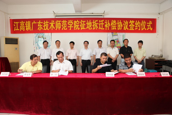 8月5日,伟德官网与白云区政府及江高镇政府签订《征地拆迁工作委托协议》,由学校委托白云区政府及江高镇政府实施伟德官网新校区征地工作。8月23日,江高镇广东技术师范学院征地拆迁补偿协议签约仪式在白云区江高镇政府会议室隆重举行,江高镇政府与被征地村村委正式签订征地拆迁补偿协议。校党委书记邝邦洪、校长王乐夫、副书记罗海鸥、副校长林卓、冯灿仪,与白云区区委叶志良常委、区政府龚辉副区长、王文生副区长,江高镇全体党政领导以及小塘村、何布村、叶边村、江村等4个被征地村的村社干部近200人,共同见证这一激动人心的时刻。