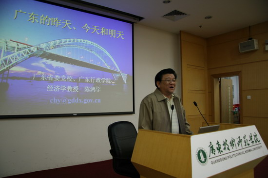 陈教授还向现场的师生们提出了一个个尖锐的现实问题,引导大家对广东的现状和未来进行理性的思考,发人深省。演讲中的陈教授表现出渊博的知识,其语言也是很幽默,精彩的演讲艺术和生动的史实介绍博得了同学们阵阵热烈的掌声。