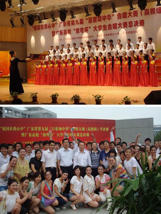 据悉,“祖国在我心中”广东省第九届“百歌颂中华”合唱大赛暨广东高校“南粤杯”大学生合唱大赛于今年4月启动,是我省庆祝新中国成立60周年的重要系列活动之一。广东省“百歌颂中华”合唱大赛自1994年创办以来, 每2年举办一次,是我省群众性文艺活动的重要品牌之一,至今已成功举办了八届,今年高校系统是历届比赛整体水平最高、参与面最广的一届,每个高校的合唱团都有自己的特色优势,充分反映出广东大学生朝气蓬勃的精神风貌和良好的艺术修养。(校团委)