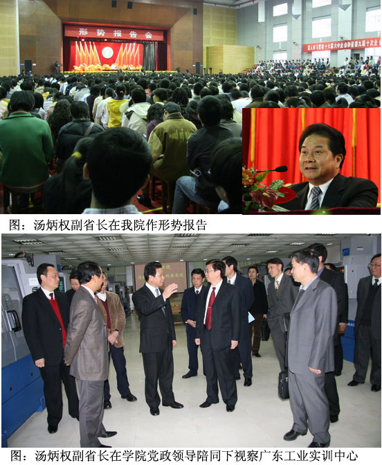 1月11日下午,学院综合馆座无虚席、掌声阵阵,广东省常务副省长汤炳权在这里向广大师生作了一场关于广东经济社会发展的形势报告。汤炳权以翔实的资料、生动的事例、精彩的语言,旁征博引,深入浅出,详细介绍了改革开放以来广东经济社会发展特别是对外开放取得的重大成就,深入分析了新世纪广东发展面临的新形势新任务,全面阐述了广东新时期的发展思路和对策措施。汤炳权充分肯定广东技术师范学院对全省经济社会发展作出的重要贡献,对学院的发展和大学生们提出了殷切的期望。