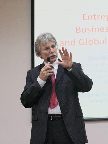 Joachim Schwalbach教授重点讲解了创业的概念及主要特征、创业者应该具备的能力、企业应承担的社会责任,创业者应注意企业利益与社会利益的结合和企业全球化的现象、意义和方式。在讲座中,Joachim Schwalbach教授用一些数据和图表来阐释问题和观点,有助于听众理解。