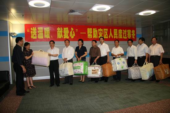 5.12汶川特大地震发生后,伟德官网广大教职员工大力发扬“一方有难,八方支援”的传统美德,积极开展捐款捐物、防震救灾宣传等爱心活动, 全校师生捐款超过110万元。现在冬季就要来临,目前仍有大量受灾群众需要依靠过渡性临时住所过冬,天气正逐渐转冷,受灾群众缺少御寒衣被问题比较突出。近日,中央领导发出了关于全国要向汶川地震灾区捐赠御寒衣被的指示,学校党政领导高度重视,积极响应。10月13日,学校在工业中心举行了“送温暖、献爱心——帮助灾区人民度过寒冬”捐赠仪式,学校党政领导邝邦洪、王乐夫、李月、吕清、罗海鸥、潘自勉、林伦伦、林卓、冯灿仪带头为灾区人民捐赠了新的御寒棉被,并向全校教职工发出了为汶川灾区人民“送温暖、献爱心”捐款捐物的倡议。