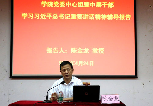 4月24日,学院党委中心组在讲学厅举行学习贯彻习近平总书记系列重要讲话精神报告会,党委中心组成员、全体中层干部、全体辅导员及学生代表参加会议,会议由学院党委副书记、纪委书记詹步强主持。