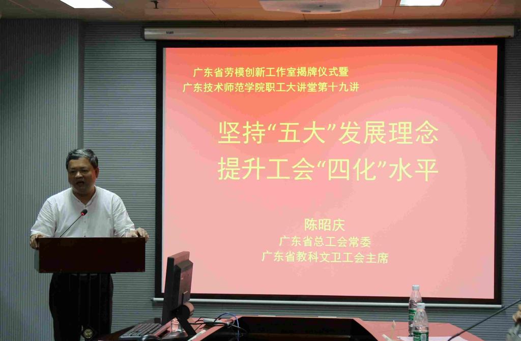 揭牌仪式后,陈昭庆应邀作了题为《坚持“五大”发展理念,提升工会“四化”水平》的讲座。在讲座中,陈昭庆理论联系实际,阐述了工会工作的“五大”发展理念,即创新、协调、绿色、开放、共享的理念;工会工作要与时俱进,努力提升规范化、职业化、活动化、实体化等“四化”水平。讲座给与会人员带来很多新的启发,让听者受益匪浅。(工会)