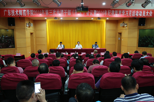 陈韶书记在会上传达学习全省“三纪”教育培训班精神并作重要讲话。他指出,纪律教育学习月活动是我院贯彻落实党的十八大精神和深入开展“两学一做”专题教育活动的重要举措,是深入推进我院惩治和预防腐败体系建设的有效抓手,是提高拒腐防变能力的有效途径,是推动学校事业健康发展的有效保证。各单位要紧紧围绕教育主题,把纪律教育学习月活动作为一项重大任务,列入领导班子重要议事日程。各级领导班子成员要切实担负起身上的责任,以身作则,带头抓好自身和所在单位的教育学习活动。