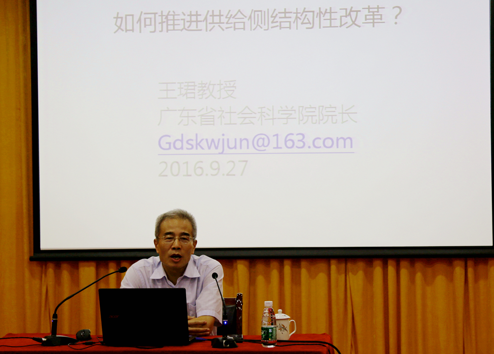 王珺教授从“什么是供给侧结构性改革?为什么要进行供给侧结构性改革?如何有效地推进供给侧结构性改革?”等三个方面进行了专题宣讲。结合全国及全球经济形势,王珺深度剖析了“供给侧结构性改革”的提出、内涵、核心与实质,列举大量详实的数据详细阐述了“六五”时期以来的广东与江浙鲁及全国经济发展的对比情况,深入分析了推进供给侧结构性改革的有利条件,深入浅出地解答了当前新经济发展的重点和有效推进供给侧改革的路径选择。