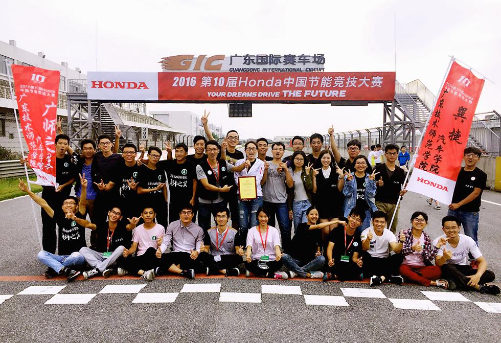 10月28日—30日,第十届“Honda中国节能竞技大赛”在广东肇庆国际赛车场举行。我院汽车学院“巽捷”车队(车队编号323,车队成员:陈思捷、蔡旭涛、朱宝钗、叶齐仁、李梓立、李喜丽、吴徐珊、卜鹏辉、郑润女,指导老师:徐伟、杨勇、杜灿谊、伍强、许铀、吴劲、王思卓)在EV电动组的比赛中,使用规定电池行驶了14556m,获全国第3名、广东省第1名的骄人成绩;“广师之翼”车队(车队编号150,车队成员:林衍颖、张灿煌、汪恒博、李庆朗、翟友邦、练展发、麦兴业、任俊羽、陈芳,指导老师:徐伟、杨勇、杜灿谊、伍强、许铀、吴劲、王思卓)在燃油组的比赛中,使用1升汽油行驶了318.88km,获全国第14名、广东省第1名的佳绩,展现了汽车学子扎实的专业知识、优秀的科创能力和比赛能力,大大提高了我院在全国高校的知名度。