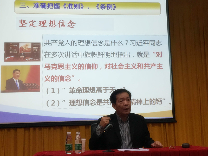 陈韶以《全面从严治党再上新台阶——全面深入学习贯彻落实党的十八届六中全会精神》为题,报告中以“一个主题”、“两大板块”、“两个完善”、“四个全面”、“四个意识”等五大关键词向大家详细解读了十八届六中全会精神,用翔实的数据和案例道出了为什么要提“以习近平同志为核心的党中央”以及怎样做到增强核心意识,用丰富的史实讲出了《关于新形势下党内政治生活的若干准则》和《中国共产党党内监督条例》的现实需要和主要内容,并号召学生党员和入党积极分子要认真学习贯彻全会精神,更加紧密地团结在以习近平同志为核心的党中央周围,牢固树立政治意识、大局意识、核心意识、看齐意识,坚定不移维护党中央权威和党中央集中统一领导,切实落实全面从严治党的要求,共同营造风清气正的政治生态,不断提升学校党建工作水平。同时要重点抓好四个结合:要与学校当前的中心工作结合起来,要与学校加强党的建设结合起来,要与配合省委巡视组的工作结合起来,要与实现更名“伟德国际1949始于英国”的奋斗目标结合起来。