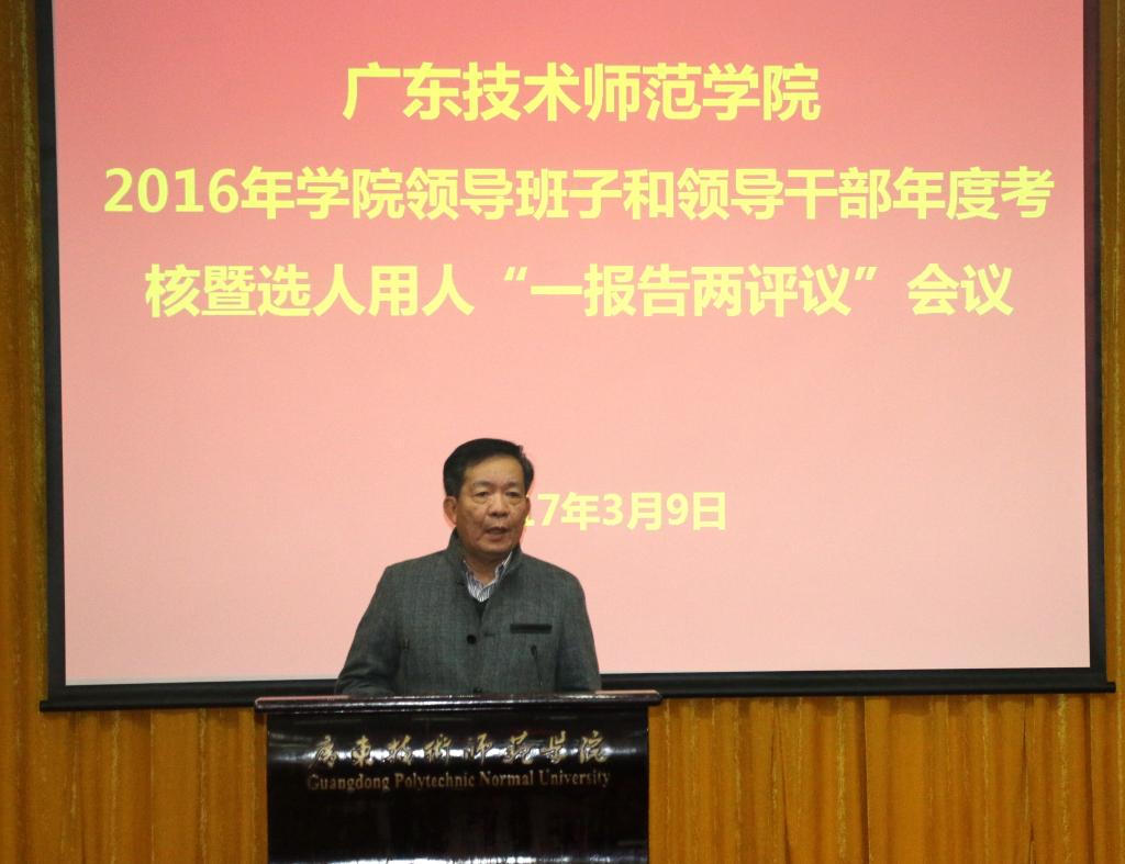 3月9日,我院召开2016年学院领导班子和领导干部年度考核暨选人用人“一报告两评议”大会。省委教育工委委派广东财经大学组织部谢访春部长、张小洁同志到会指导考核测评工作。学院领导班子成员、全体中层干部、民主党派负责人,以及正高职称教师代表、党代表、双代会代表、离退休人员代表共169人参加了会议。会议由学院党委书记陈韶主持。