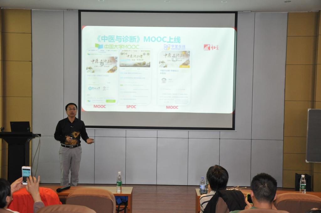 孙立教授作题为《慕课建设和混合教学经验分享》专题报告。他以自身所教授的课程《中医与诊断》课程为例、以教师都是“编剧、导演、明星”的诙谐比喻,来讲解了慕课的分析,设计与制作。孙立还介绍了自己利用“SPOC+翻转课堂+混合学习”来讲授《中医与诊断》的经验,他认为,实时互动混合式学习模式下也不要轻易跳过教学步骤,混合式学习不是不要教学,而是创造创新教学模式。
