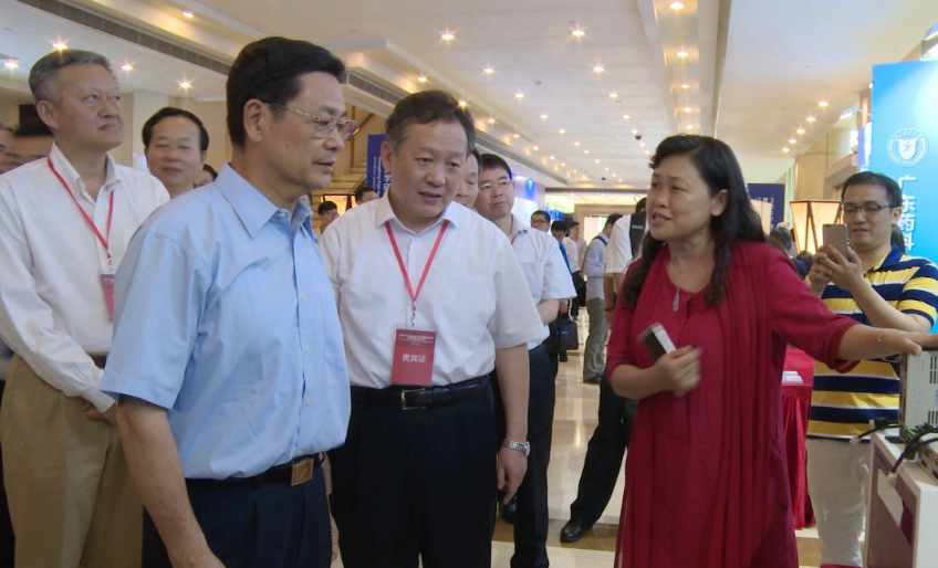 图为赵慧民教授向省政府党组成员陈云贤、景李虎厅长介绍其科技成果在佛山产业化情况。