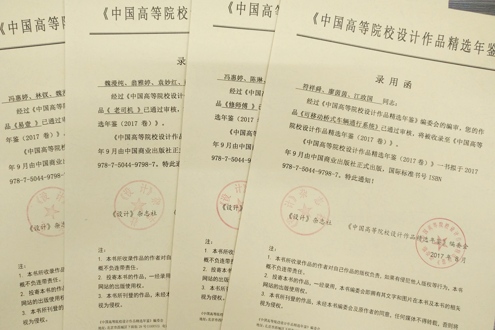 《设计》是中国科学技术协会主管、中国工业设计协会主办、中国家用电器研究院承办的设计行业权威杂志。中国高等院校设计作品大赛是由《设计》和中国国际设计产业联盟共同主办的专业赛事,旨在聚合行业的力量、推动国内设计行业发展。大赛得到全国高等院校师生的积极响应和热情支持,近300所高等院校师生的2000多件作品参赛,最终教师组和学生组共有19件作品获大赛一等奖(教师组4件,学生组15件),57件作品获大赛二等奖,114件作品获三等奖,部分入围作品获优秀奖。经过组委会遴选,共有300余件进入终评的设计作品入选《中国高等院校设计作品精选年鉴(2017)卷》,并将正式出版发行,我院共有4件作品入选。