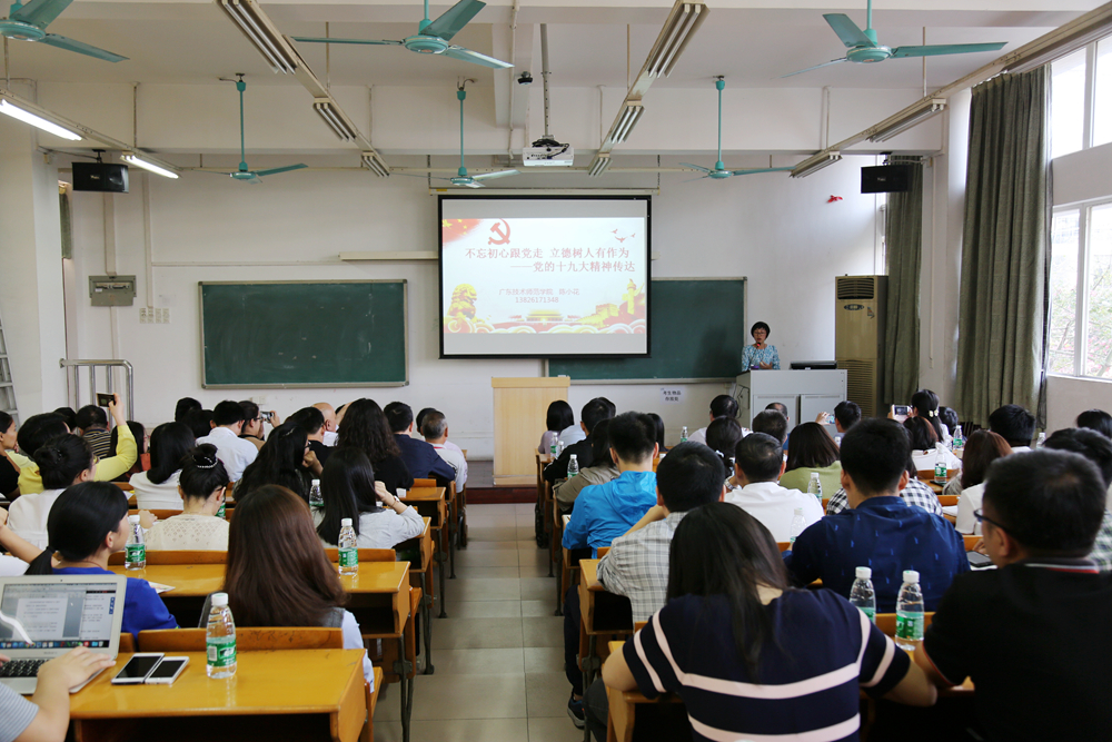 她的报告主要分为两个方面:一是介绍党的十九次全国代表大会各项议程,从她近距离贴近大会的视角为我们呈现了许多细节,让大家深刻感受到风清气正的务实会风、心系民众的各层领导、业务精干的各界代表;二是对习近平总书记十九大报告内容的精解,她从党的十八大以来取得的十个方面的历史性成就入手,用事实和数据说话,凝练地归纳了会议精神的“三新”,即新时代、新思想、新征程。接着,她又对十九大报告中有关高等教育、职业教育、青年培育、思政引领、文化自信、就业创业等方面内容做了深入的阐述,并从国家教育的战略大局出发,以一个高校教育工作者和政工干部的身份,呼吁和鼓励大家不忘初心跟党走、立德树人有作为!