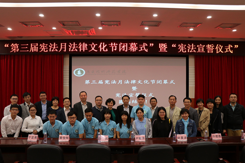 12月4日,在第四个国家宪法日来临之际,由党委宣传部、依法治校办公室主办,法学与知识产权学院承办的第三届宪法月法律文化节闭幕式暨宪法宣誓仪式当天下午在白云校区104报告厅举行。党委宣传部、依法治校办、学生处、法学与知识产权学院相关负责人及法学与知识产权学院师生出席。