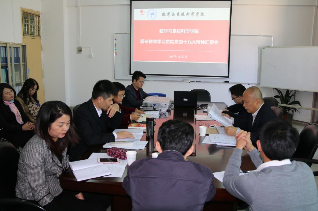12月7日下午,潘自勉副院长到数学与系统科学学院开展调研督导学习贯彻党的十九大精神工作。调研汇报会在校本部一教1211室举行,数学与系统科学学院党政领导班子成员、系(部)主任、党支部书记和教师代表出席了汇报会。