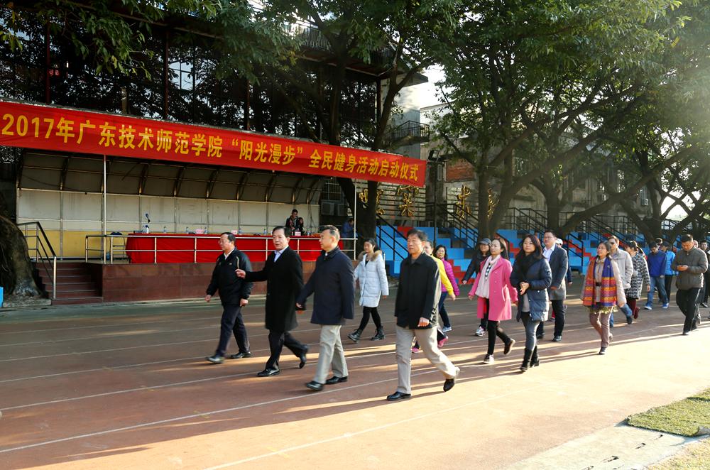 为积极响应教育部、国家体育总局、共青团中央联合发出的全国亿万学生阳光体育冬季长跑运动的号召,认真落实“健康第一”的理念,积极推动全民健身活动的开展,提高学生身体素质,12月18日,在学院党委和行政的高度重视下,我院在校本部、白云校区、西校区同步启动了2017年“阳光漫步”全民健身活动。学院党委书记陈韶,学院院长郭杰,党委副书记詹步强,副院长冯灿仪、戴青云,学院体育运动委员会委员、体育部全体老师及各二级学院、职能部门1600余名师生代表参加了启动仪式。冯灿仪主持启动仪式并致辞。