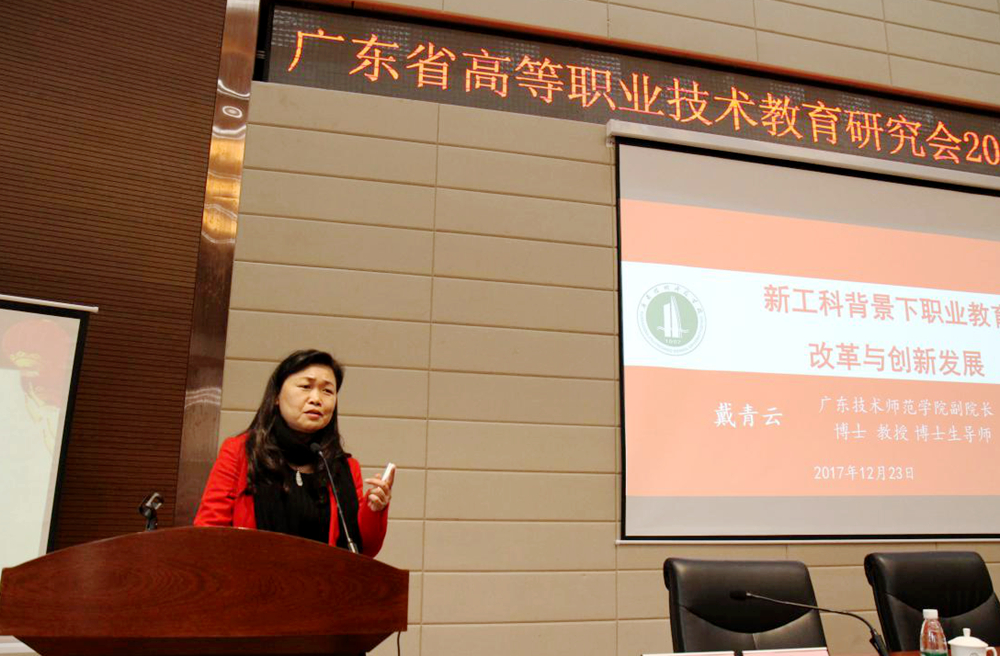 年会围绕广东一流高职院校建设探索与实践研究、中国制造2025背景下广东高职院校人才培养路径研究、一带一路背景下广东高职院校国际化发展路径研究以及互联网+背景下高职院校创新创业教育理论与实践研究等主题进行探讨。来自广东技术师范学院、广州番禺职业技术学院、广州城建职业学院、广东理工职业学院、珠海城市职业技术学院、广州科技贸易职业学院、广东环境保护工程职业学院、广州地铁集团有限公司等院校和企业的代表先后作了主题报告。戴青云在主题论坛中作了题为《新工科背景下职业教育改革与创新发展》的报告。戴青云从办学治校能力和人才培养质量等两个层面结合智慧学习工厂等时下教育热点以及广东技术师范学院人才培养的实际阐述了产教深度融合的建设发展思路。
