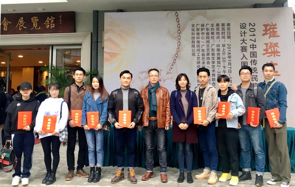 1月8日,由广东省文学艺术界联合会、广东省民间文艺家协会、广东省艺术与设计教育协会等单位共同主办的“2017中国传统民艺再生珠宝配饰设计大赛”颁奖典礼暨入围作品展在岭南会展览馆举行。我院美术学院服装系2014级产品设计专业学生唐家辉、黄堉的作品《同·心》(指导老师:刘雯雯)获得二等奖,奖金8000元;2014级产品设计1班陈以冠、黄堉、黄君婧、唐家辉、涂德菊、杨家炜、曾顺钟、朱成斌,2015级产品设计1班潘丽君等同学获入围奖。