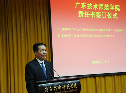 会上举行了《2018年广东技术师范学院落实意识形态工作“六项责任制”责任书》《2018年广东技术师范学院落实校园安全稳定工作责任书》签约仪式,学院党委书记陈韶、院长郭杰与文学与传媒学院党委书记白雪飞、网络信息中心主任方刚、财经学院党委书记吴松、院长谢林林、总务处党总支书记黄锡炳、处长舒立新分别在责任书上一一签名。