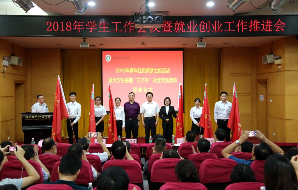会上举行了“青年红色筑梦之旅活动”暨“大学生暑期三下乡社会实践活动” 授旗仪式。凌靖波、郭杰为十九大宣讲小分队、教育中国小分队、幸福中国小分队、科技中国小分队、法治中国小分队和健康中国小分队等队伍代表授旗。大会还为各宣讲团队发放了队旗和宣讲资料。