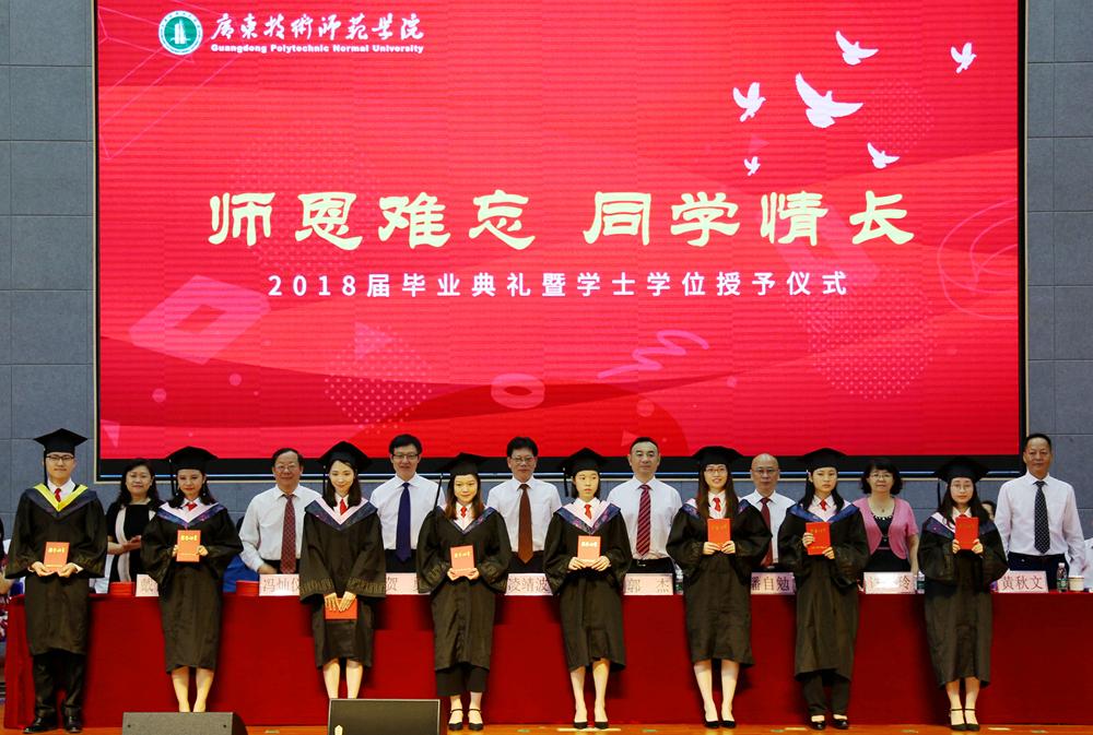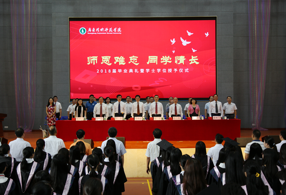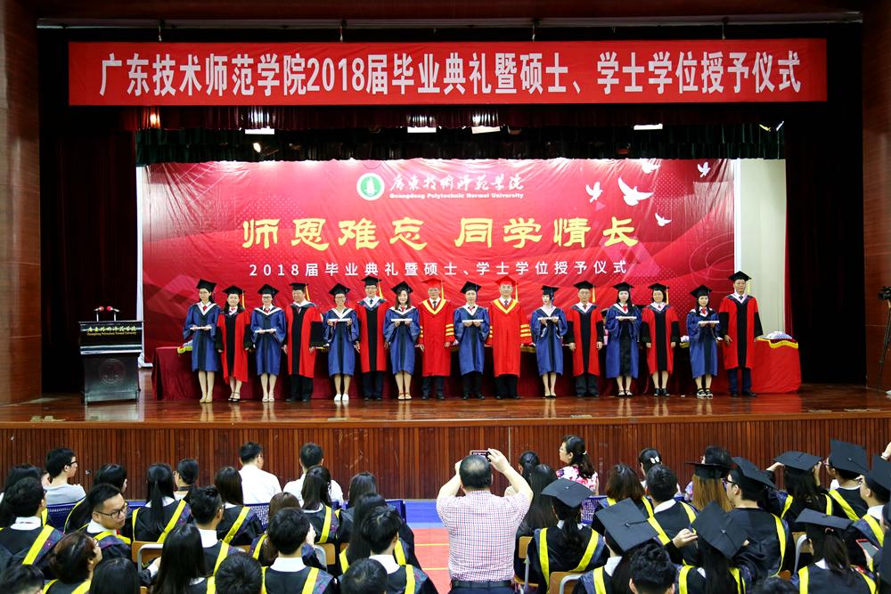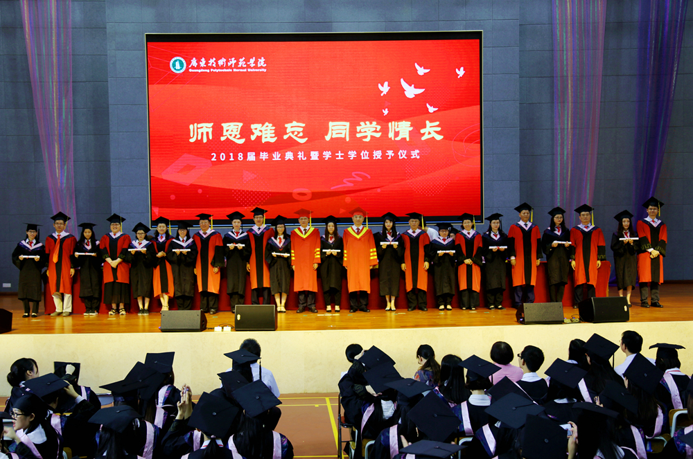 在悠扬的乐曲声中,脸上洋溢着自信的笑容,散发着青春气息的毕业生们依次走上主席台,由身着导师服的校领导及各二级学院书记、院长、教师代表为他们扶正流苏、授予学位,并与毕业生合影留念,典礼现场热烈而温馨。当学位帽上的流苏被从右到左轻轻地拨过,微笑、握手、合影,莘莘学子难忘的求学历程划上了圆满的句号。从此,广技师又添校友;从此,聚散心系母校。